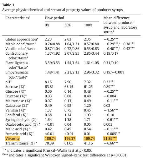 In the table, flow period is the percent of the sap flow that season. But why does viscosity change? Just an educated guess but look at how the sugars change. Sucrose goes down and both glucose and fructose go up. Sucrose is a bigger molecule. Despite being microscopic, the bigger molecules could collectively feel more viscous. Glucose goes up from 0.06% to 0.48%. That still looks like a small number.